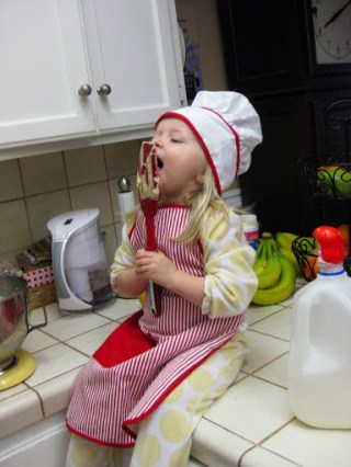 Teaching a self-centered two year old how to serve someone isn’t exactly easy. I think for this age, teaching a child to serve has more to do with modeling than it does instructing. Lucky for me Addie is very observant and eager to help, so into the kitchen we went, Addie donning her apron to make dip for apples. (And if you look closely, you’ll even see Ariel hanging out with us. Addie gave her a prime spot to watch the action–on top of the milk jug.)