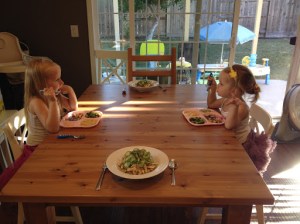 It wasn’t always that way. At first, the girls protested. They whined and complained and feigned disgust and spit food out and begged for macaroni and cheese, or yogurt, or crackers — just like most toddlers are prone to do. But slowly, they came to realize that the food they’re given is all they get, and when they see us eating it, they figure it can’t be all that bad (I suppose).