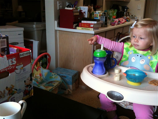 As I started to pack up the kitchen, I encountered a bit more internal resistance than I expected. So much of my day is spent in this too-small kitchen, which often irritates me, but usually makes me feel warm and happy. This is the kitchen where Addie learned to crawl, the kitchen where she started to learn how to help me cook, and the kitchen where Mia first sat contentedly in her bouncer and watched me as I chopped and stirred and braised my way to dinnertime. It’s the kitchen where at any given moment, I might look up from the stove and see crayons, sippy cups, rattles and books strewn about, with two little faces miraculously entertaining themselves while I did dishes or put away groceries. So you see, I just couldn’t pack it all away, as if doing so would separate me from tangible reminders of some of the happiest moments of my days.