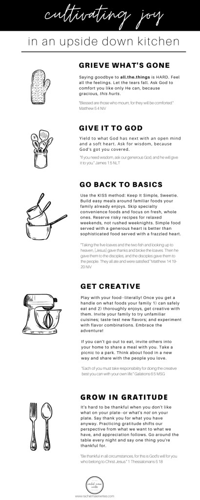 Cultivating joy in an upside down kitchen is hard because it hurts. These five steps help you make peace with unwanted changes and find joy in the middle of the mess. Download the free infographic here.
